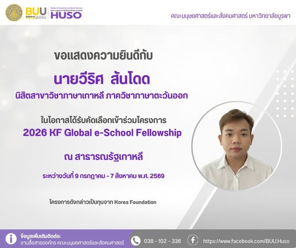 นายวีริศ สันโดด นิสิตสาขาวิชาภาษาเกาหลี ภาควิชาภาษาตะวันออก คณะมนุษยศาสตร์และสังคมศาสตร์ มหาวิทยาลัยบูรพา ในโอกาสได้รับคัดเลือกเข้าร่วมโครงการ 2026 KF Global e-School Fellowship ระหว่างวันที่ 9 กรกฎาคม – 7 สิงหาคม พ.ศ. 2569
