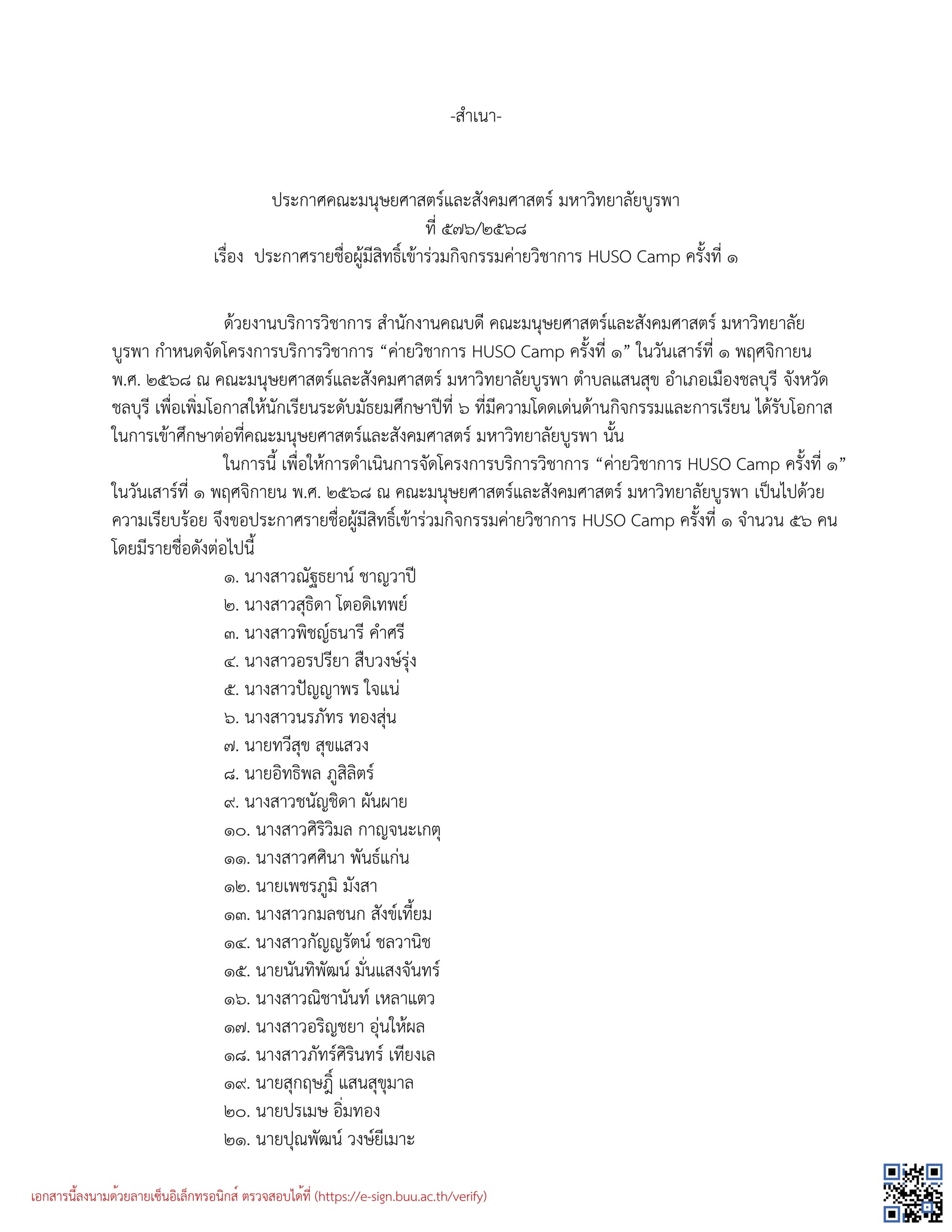 ประกาศรายชื่อผู้มีสิทธิ์เข้าร่วม ค่ายวิชาการ HUSO Camp รุ่นที่ 1