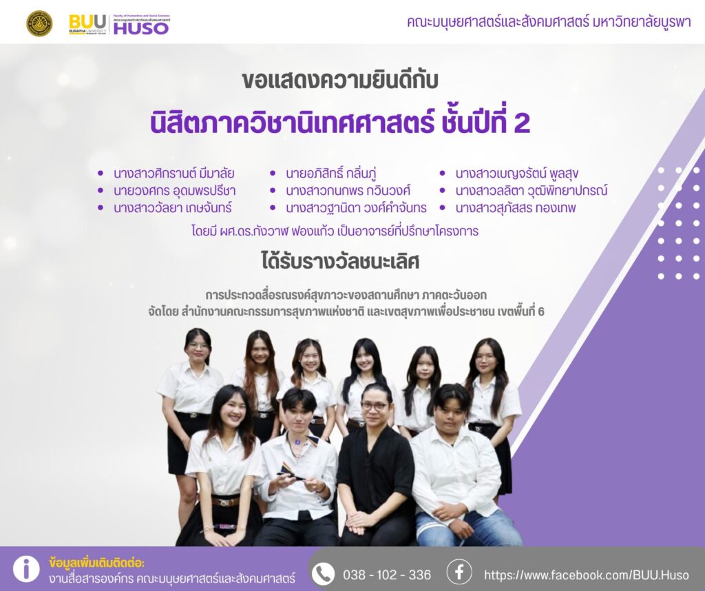 Burapha University’s Faculty of Humanities and Social Sciences would like to congratulate Assistant Professor Kangwan Fongkaew, Ph.D., and the second-year Communication Arts students on placing first, second, and third in the Eastern Educational Institution Health Promotion Media Contest. The National Health Commission Office and the Health Zone for the People in Area 6 coordinated the competition.