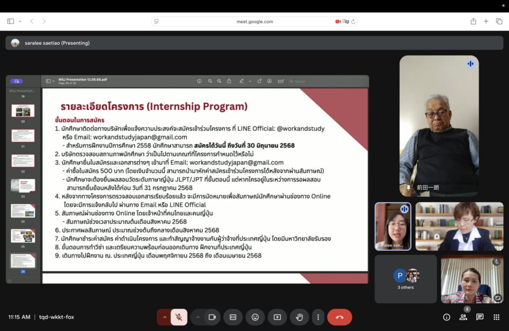 On May 13, 2025, the Department of Oriental Languages, Japanese Language Program, Faculty of Humanities and Social Sciences, Burapha University, hosted an online conference to collaborate on academic exchanges with Work and Study Japan regarding the Internship Program in Japan for Japanese language students who want to intern at various establishments in Toyama Prefecture, Japan, with no limit on the number of applicants, in accordance with the CWIE guidelines. The conference was attended by key executives from the company as well as Japanese language faculty members.