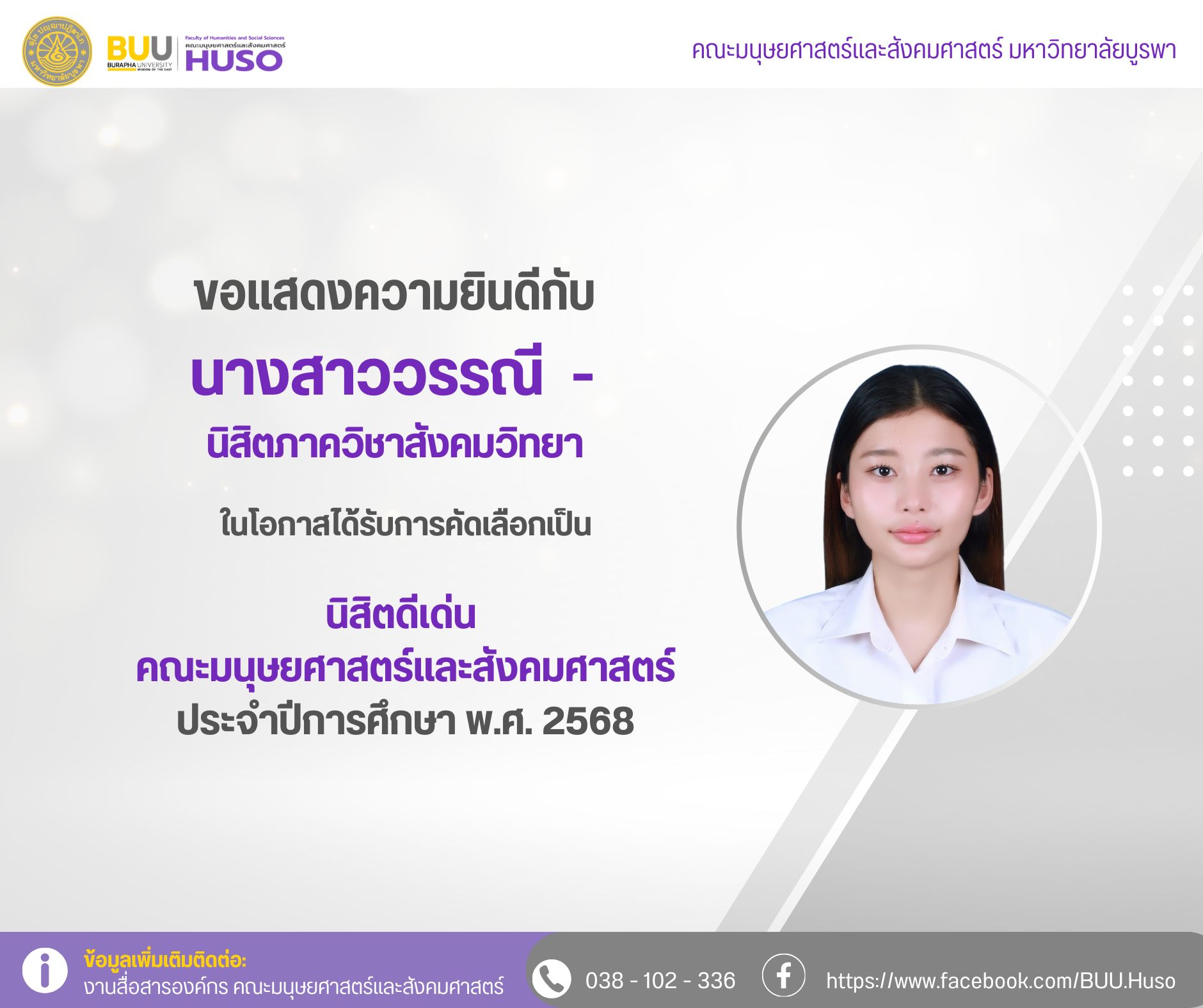 The Faculty of Humanities and Social Sciences at Burapha University would like to congratulate Ms. Wanni, a student in the Department of Sociology, on being named an Outstanding Student for the 2025 academic year.
