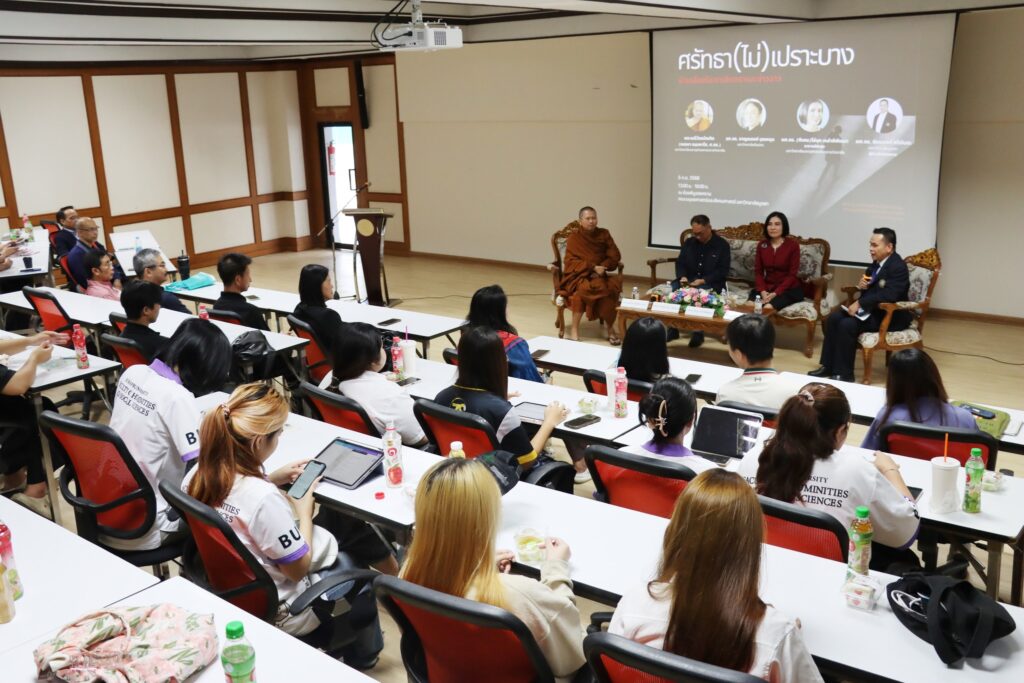 On September 5, 2025, the Department of Religion and Philosophy, Faculty of Humanities and Social Sciences, Burapha University, held an academic seminar titled “Faith (Not) Fragile: Saffron Robes in the Shadow of Money and Scandal.” The seminar was attended by Phra Methee Wachbandit (Prof. Hansa Thammahaso,PH.D), Director of the Doctor of Philosophy Program in Buddhist Studies at Mahachulalongkornrajavidyalaya University; Associate Professor Chananarong Bunnun,(PH.D) Lecturer in the Department of Philosophy, Faculty of Arts, Silpakorn University; and Asst. Prof. Kaimook Laopipatana,(PH.D) Special Lecturer at Mahachulalongkornrajavidyalaya University’s Graduate School.