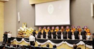 On October 10, 2025, representatives from Burapha University’s Faculty of Humanities and Social Sciences took part in an alms-giving ceremony to honor the death anniversary of His Majesty King Bhumibol Adulyadej the Great. The Employees Council organized the event, which took place at Burapha University’s Thamrong Buasri Auditorium.