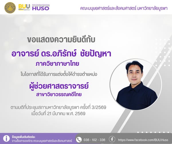 We would like to extend our congratulations to Apirak Chaipanya, Ph.D., a faculty member of the Thai Language Department in the Faculty of Humanities and Social Sciences at Burapha University, on his appointment as Assistant Professor in Thai Literature. This decision was made by the Burapha University Council during meeting No. 3/2569 on March 21, 2026.